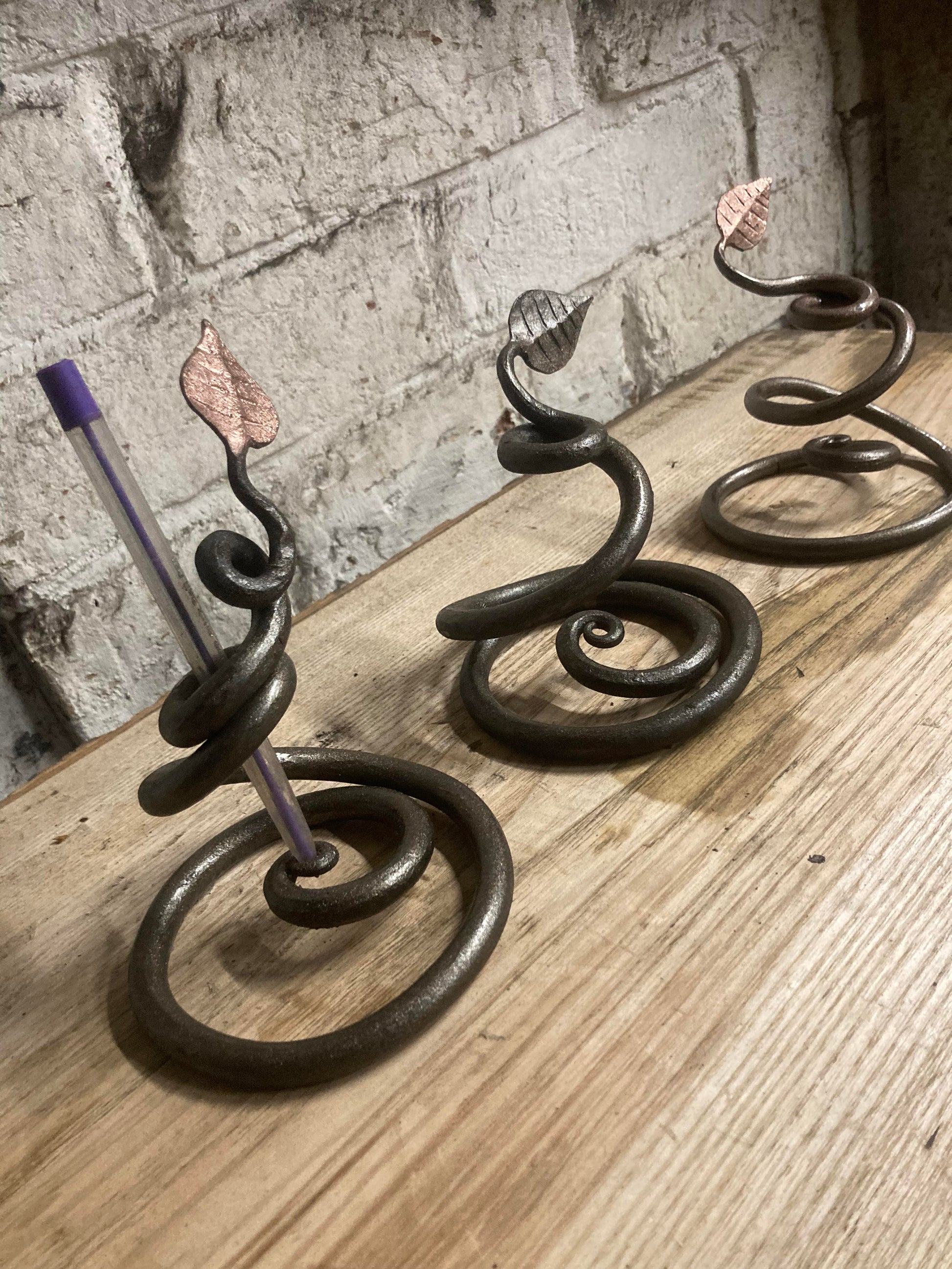 A beautifully scrolled desk ornament capable of holding almost any size and shape of pen.